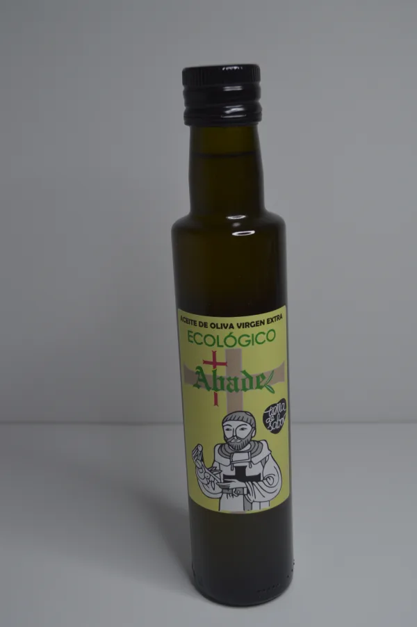 Aceite de Oliva Ecológico Abade de Aceiteros del Águeda. El mejor aceite de oliva ecológico procedente de la zona de los Arribes del Águeda. Elaborado con aceitunas propias en la primera almazara ecológica de Catilla y León. Tierra de Sabor. Botella de 250 ml. con tapón antigoteo.
