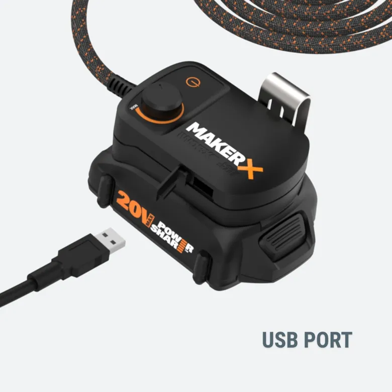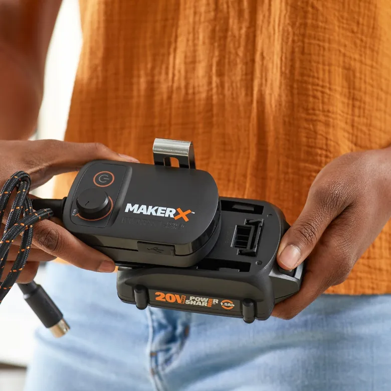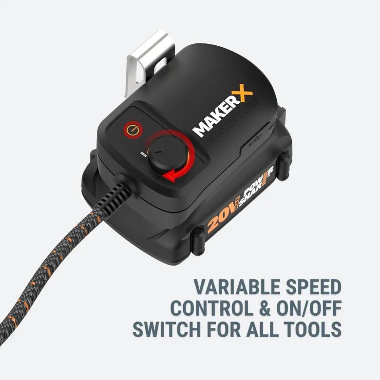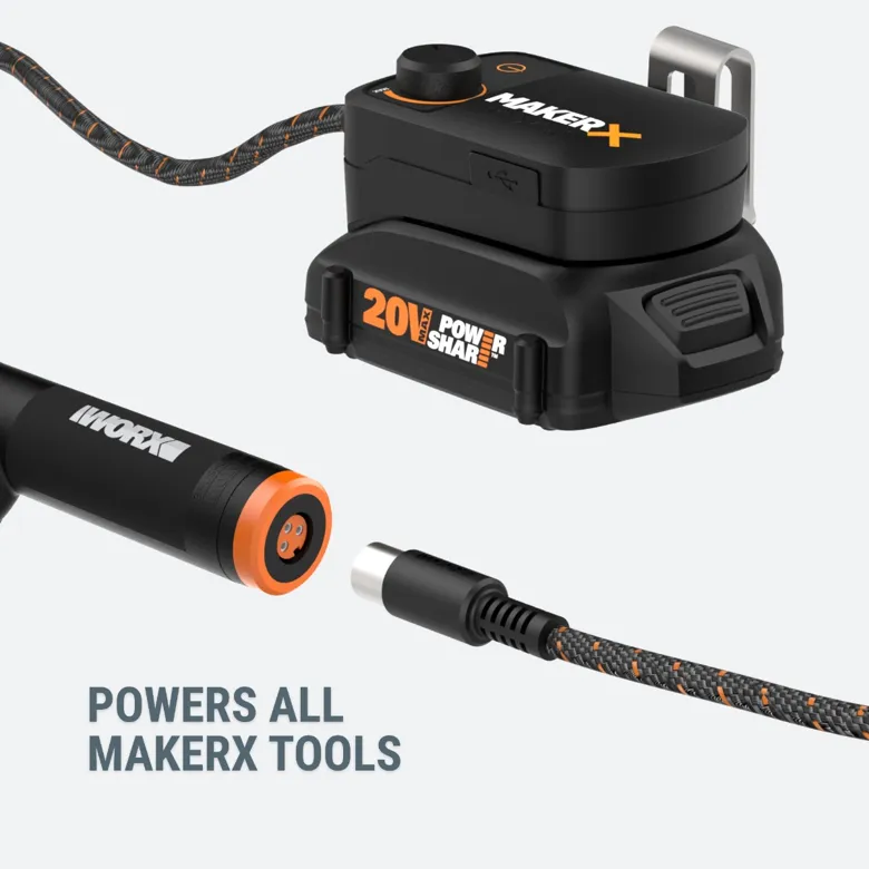 Hub para la gama de mini herramientas MakerX WORX de 20V, el único sistema de energía portátil de 20V para herramientas de manualidades en el mercado. Batería de 20V y cargador para batería de 20V.