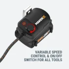 • Base Hub para la gama de mini herramientas MakerX WORX de 20V, el único sistema de energía portátil de 20V para herramientas de manualidades en el mercado. La gama MakerX se integra alrededor de este Hub emparejado a cualquier batería PowerShare de 20V de Worx. El Hub suministra energía a todas las mini herramientas MakerX a través de un cable ligero que se conecta al puerto de cada herramienta. Además también controla muchas de las herramientas con un interruptor de encendido / apagado y un dial de velocidad variable que marca la diferencia en las herramientas correspondientes. Incluye un puerto USB y un clip de cinturón.