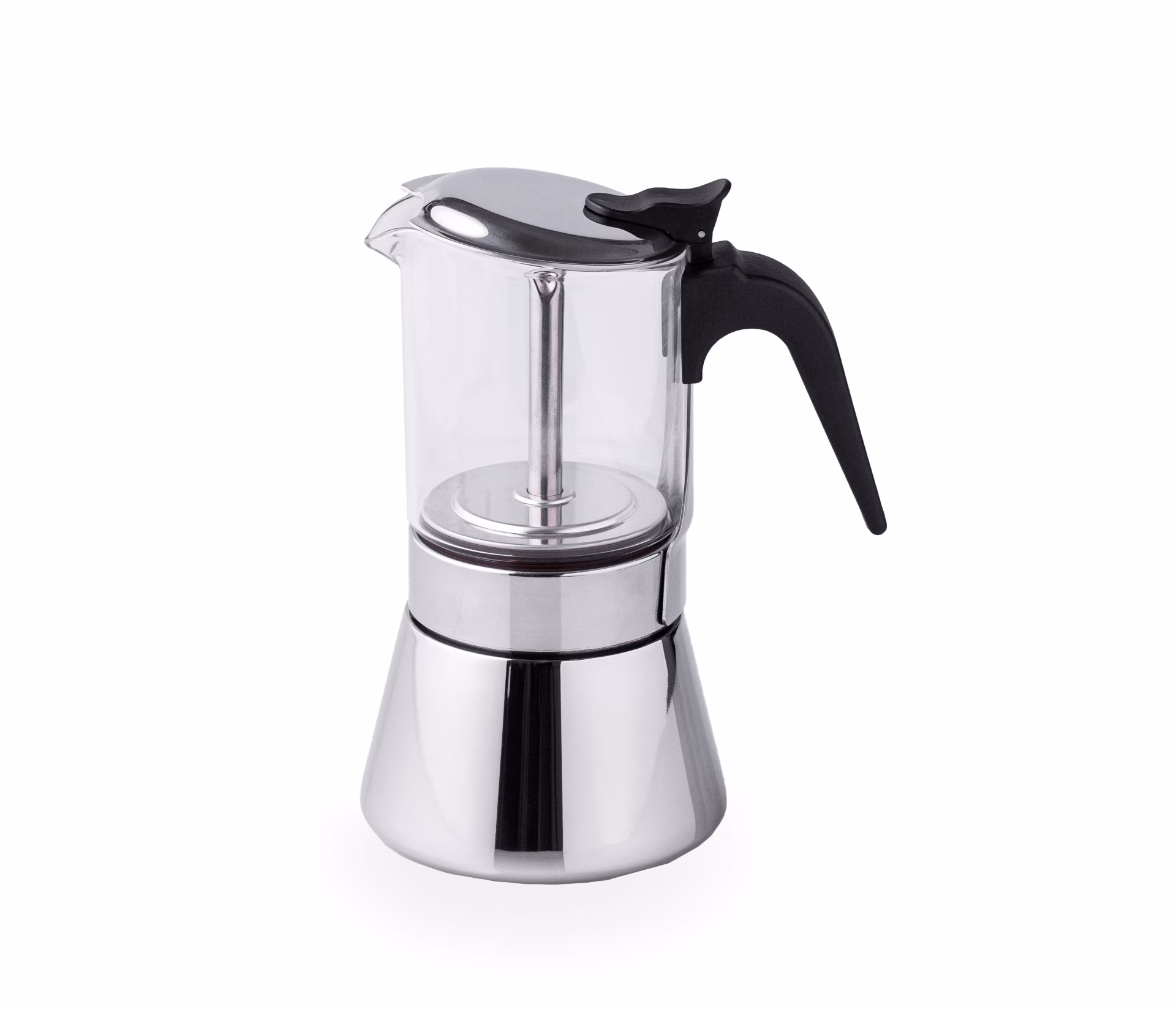 ¿Algo mejor que ver salir el café, poco a poco, en la cafetera italiana? Puedes disfrutar de ese espectáculo hipnótico todos los días con nuestra cafetera de vidrio y acero inoxidable. Capacidad 10 tazas.