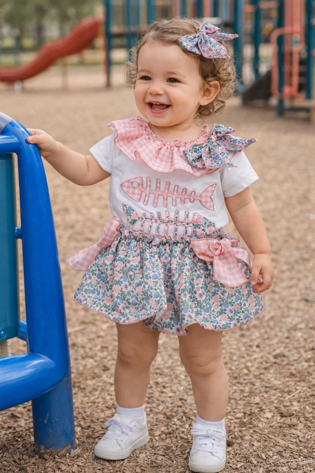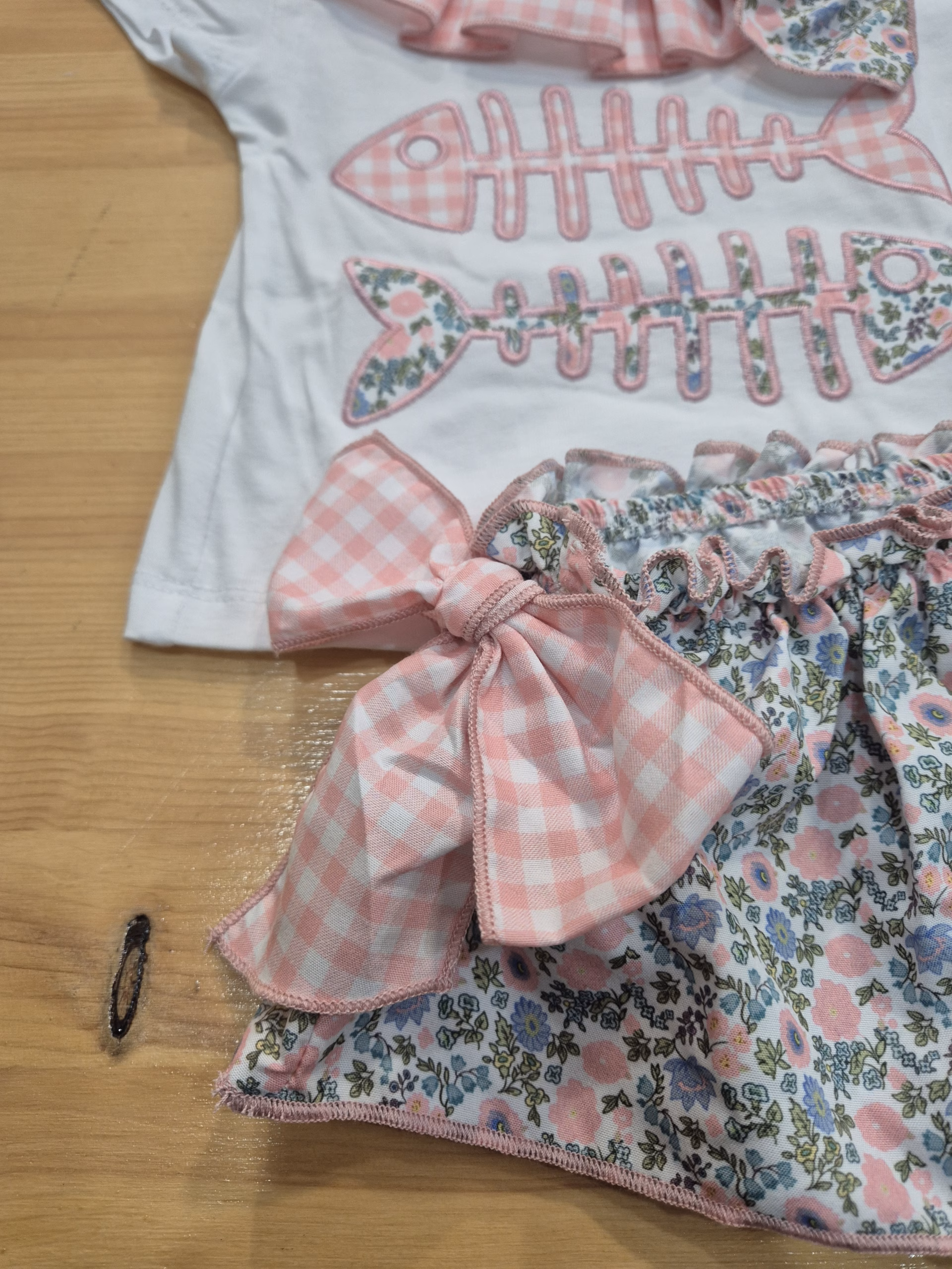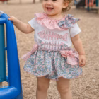 Conjunto de dos piezas niña. Camiseta de algodón con cuellito y lazo. Braguita tipo falda con elástico y lacitos. Súper cómodo.