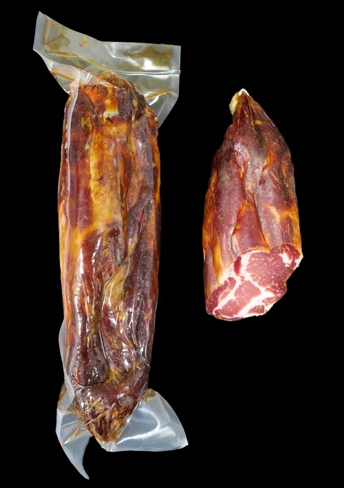 Ingredientes: Cabecero de cerdo, sal, pimentón, especias naturales, azúcares, conservadores (E-250, E-252) y antioxidante (E-301).