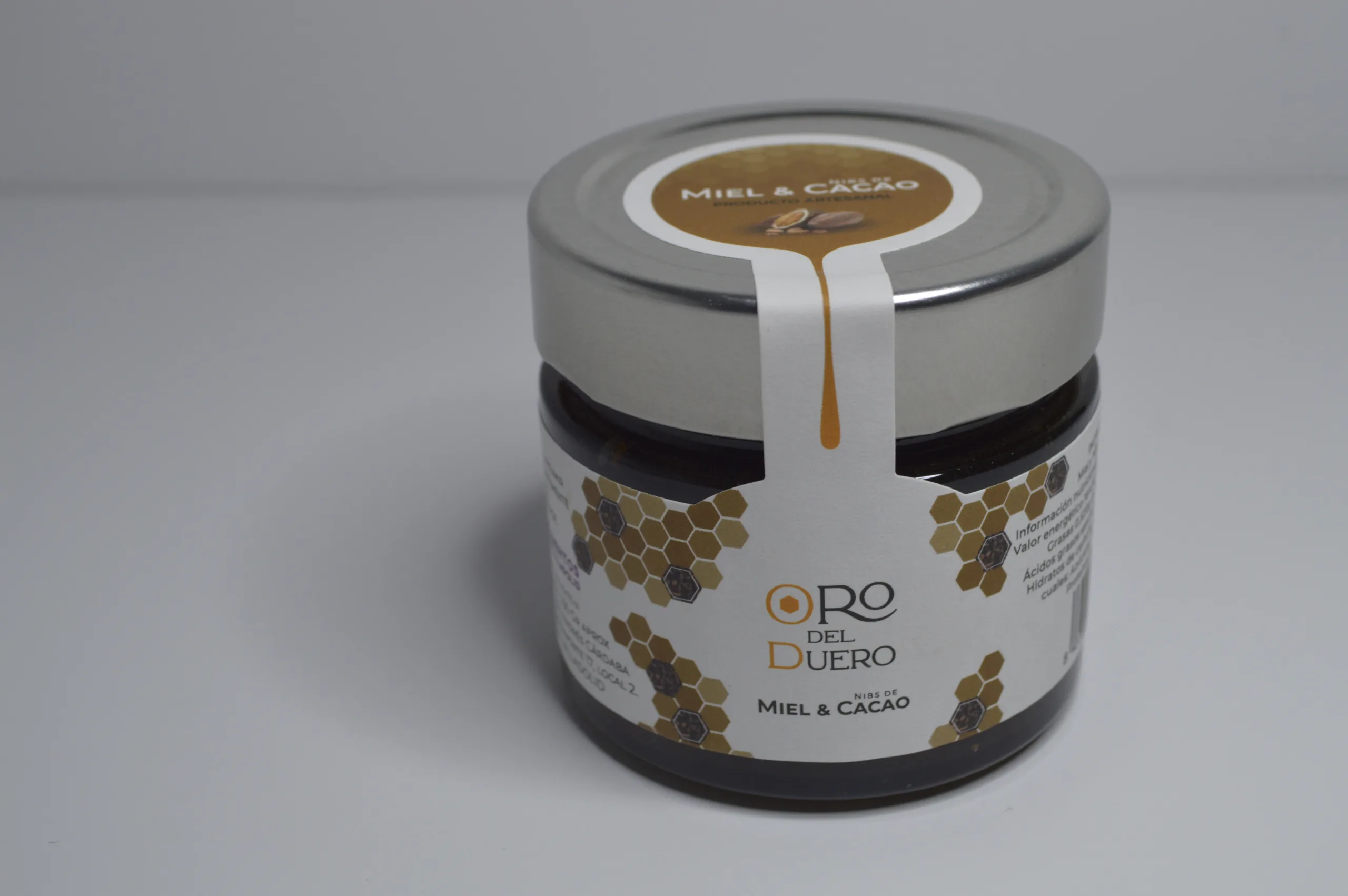 Miel & Nibs de Cacao Oro del Duero. Exquisita fusión de miel de brezo, intensa y aromática , con delicados nibs de cacao puro. Un experiencia sensorial única con matices tostados y notas amargas que equilibran a la perfección el dulzor natural. Frasco: 230 grs aprox.