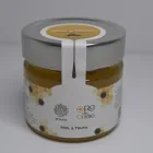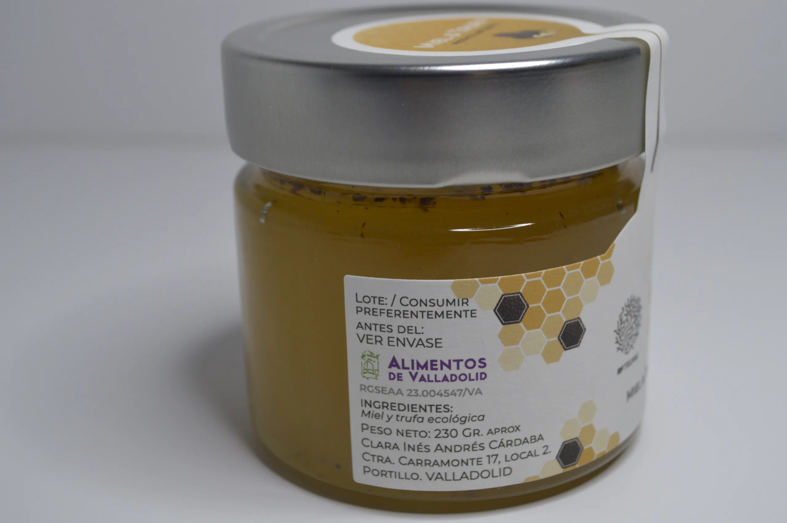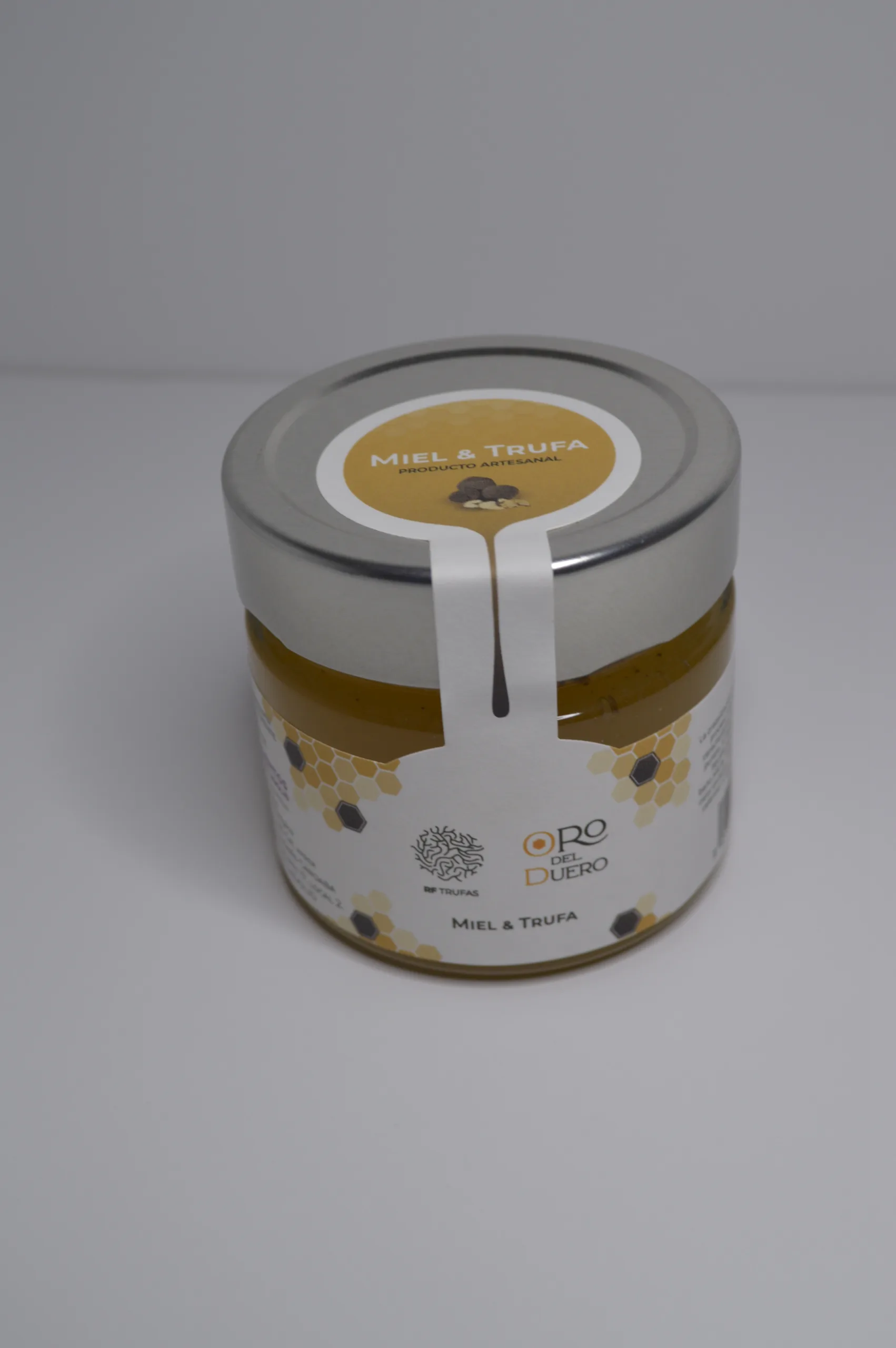 Miel & Trufa ecológica Oro del Duero. Esta miel con trufa negra es una delicia artesanal elaborada con miel de primavera, de acacia, romero, flores de anís y la preciada trufa negra (Tuber melanosporum). Ofrece un equilibrio perfecto entre el dulzor natural de la miel y el intenso aroma terroso de la trufa. Frasco: 230 grs aprox.