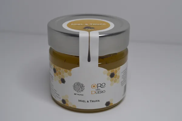 Miel & Trufa ecológica Oro del Duero. Esta miel con trufa negra es una delicia artesanal elaborada con miel de primavera, de acacia, romero, flores de anís y la preciada trufa negra (Tuber melanosporum). Ofrece un equilibrio perfecto entre el dulzor natural de la miel y el intenso aroma terroso de la trufa. Frasco: 230 grs aprox.