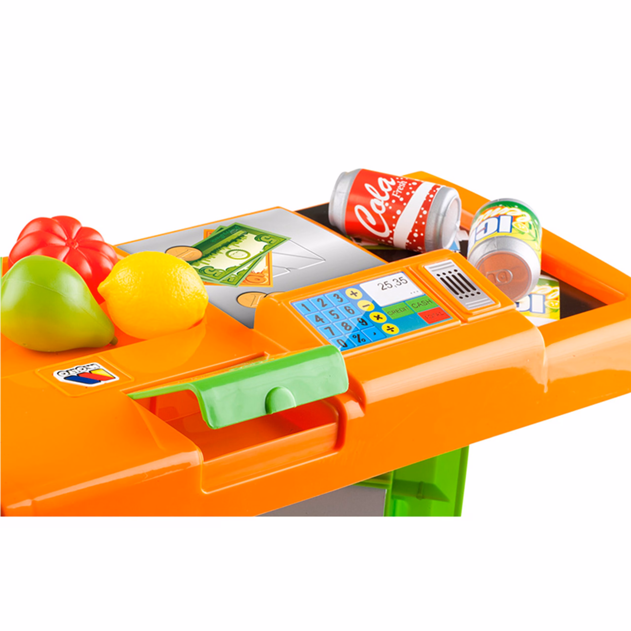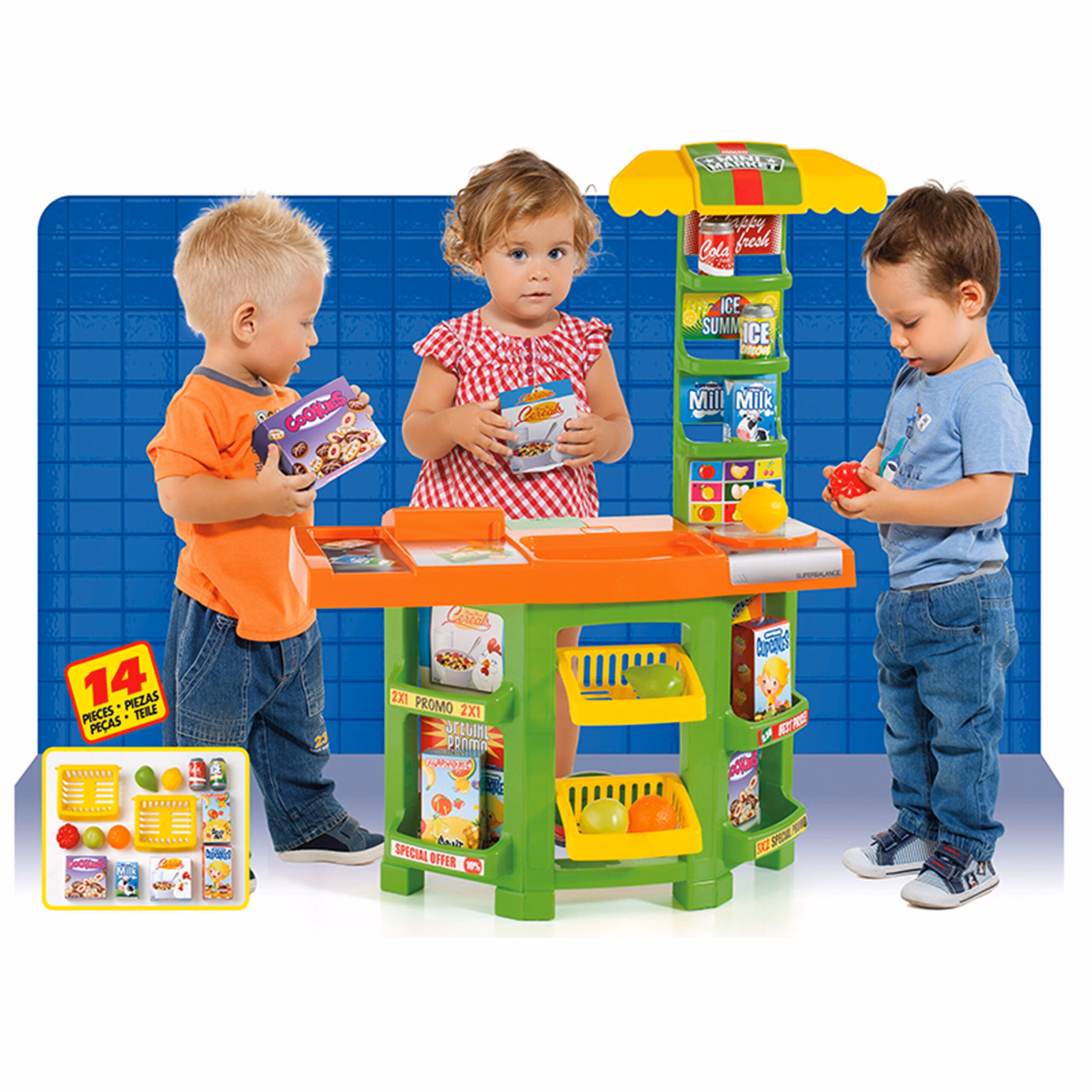 Incluye mostrador, estanterías y múltiples accesorios de alimentación que invitan a los pequeños a asumir diferentes roles como vendedor o cliente. Su estructura es robusta, estable y segura, fabricada en plástico resistente de alta calidad.