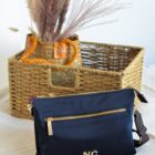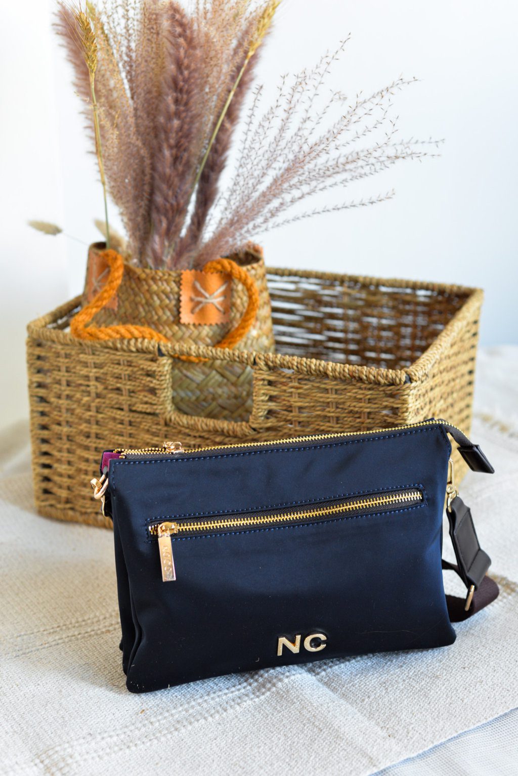 Iniciales NC en metal dorado en la parte frontal del bolso.