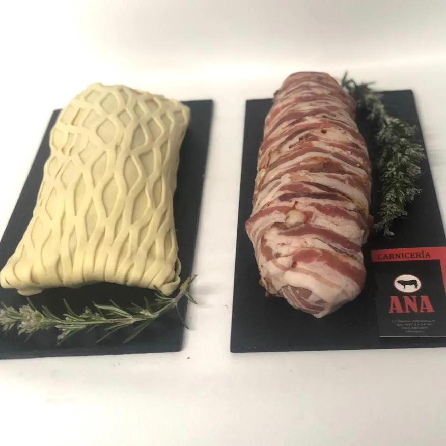 Solomillo de cerdo relleno de mousse de pato y paletilla ibérica envuelto en panceta ibérica.