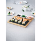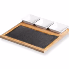 Tabla fabricada en bambú con una base en pizarra natural extraíble. Incluye 3 cuencos cerámicos blancos, complemento para servir salsas y condimentos. Es resistente y mantiene la temperatura gracias a las propiedades térmicas de la pizarra natural.