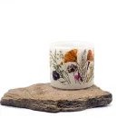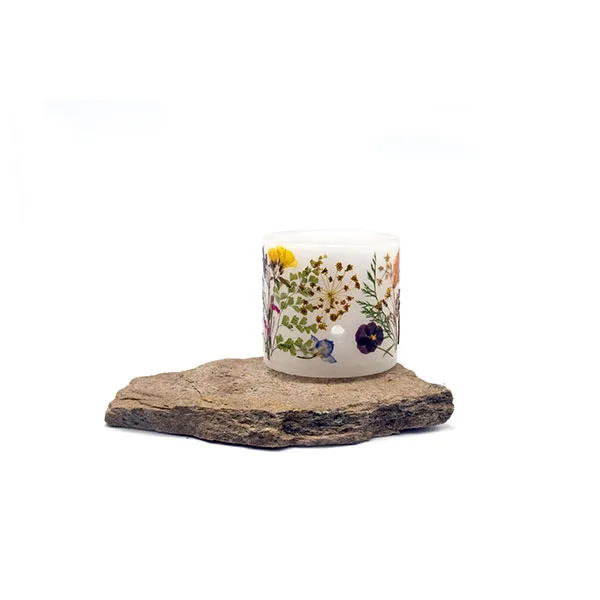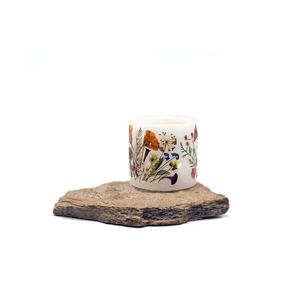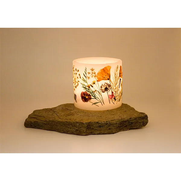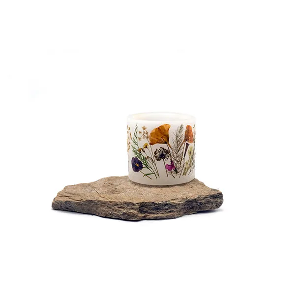 Velas artesanales realizadas en parafina, decoradas con flores naturales de nuestro entorno, que recolectamos, prensamos y secamos para después pegarlas sobre el fanal. Tienen 2 agujeros que sirven para que la vela interior respire y arda mejor. Lo que se enciende es la velita de té que tiene en el interior, por lo que el fanal no se gasta. Cuando la luz ambiente es tenue resaltan mucho las flores, creando un ambiente muy especial. Son válidas tanto para el interior como para exterior.