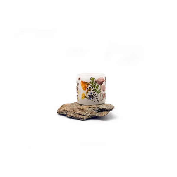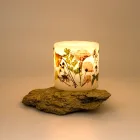 Fanales decoradas con flores naturales de nuestro entorno, que recolectamos, prensamos y secamos para después pegarlas sobre el fanal. Incluye velitas para colocar en el interior.