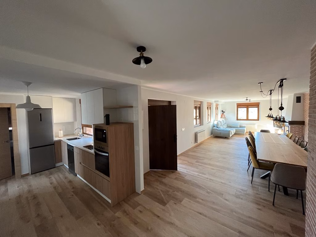 Espacioso salón con chimenea, y una cocina completamente equipada.